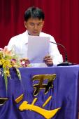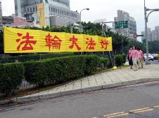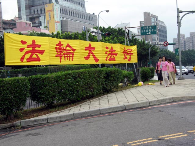 ![]() 剑潭海外青年活动中心大门口的“法轮大法好”横幅 | ![]() 8月14日下午经国厅的法会现场 |