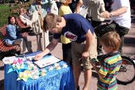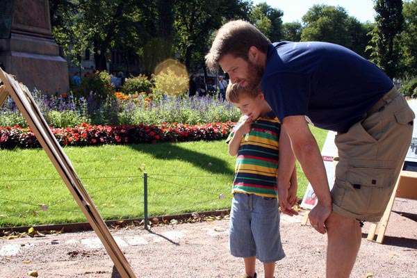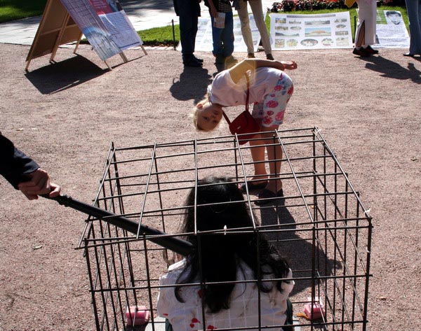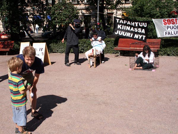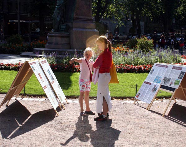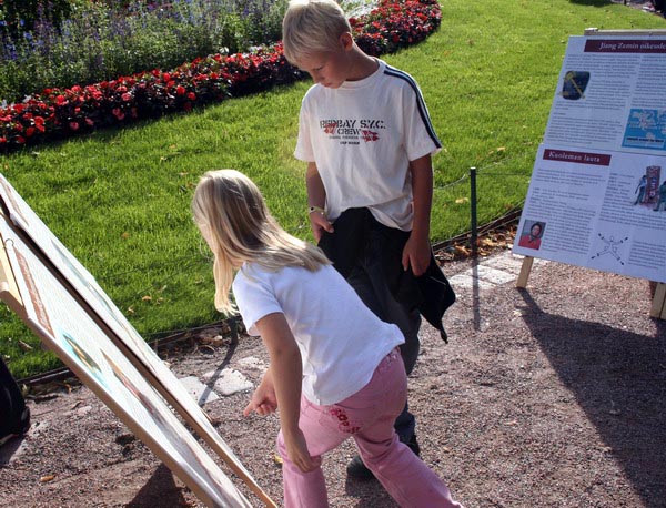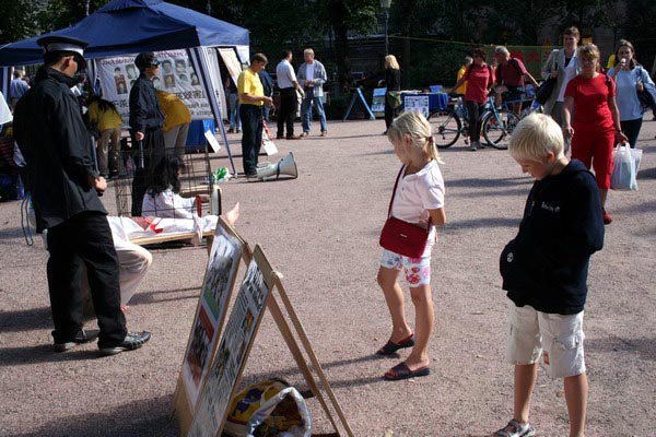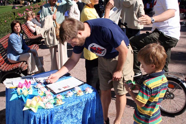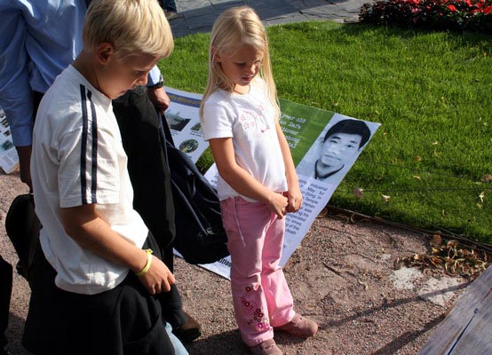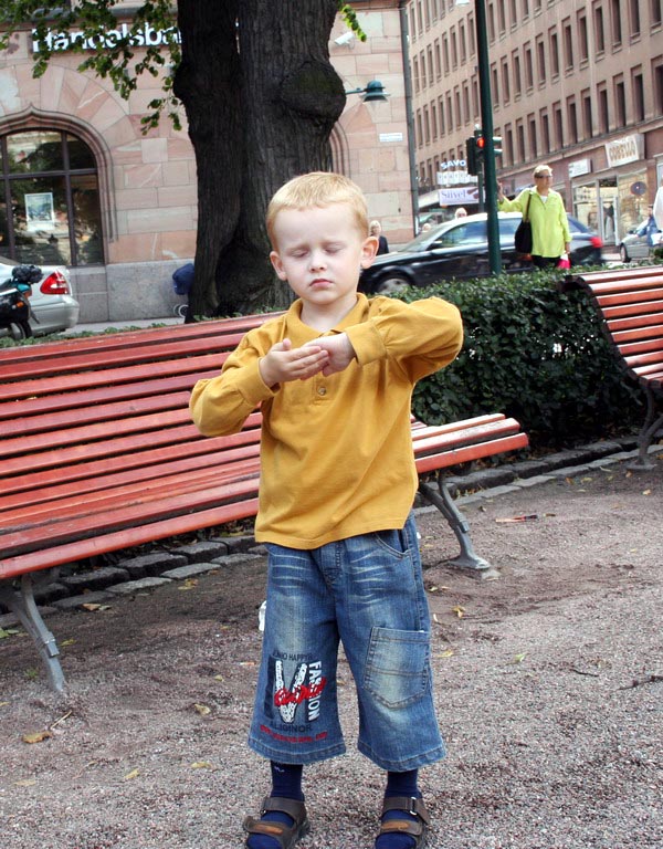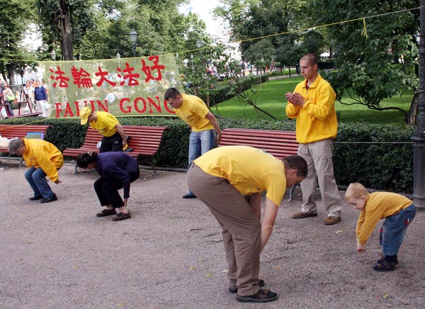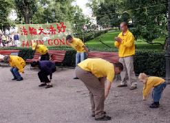 来自拉脱维亚的法轮功小弟子安德烈正伴随着美妙祥和的音乐演示功法,优美的功法表演吸引了大批游客,人们停住脚步全神贯注的观看。当有人问他为什么要来这里时,小安德烈歪着头认真的说,我就是想告诉大家:“法轮大法好!”