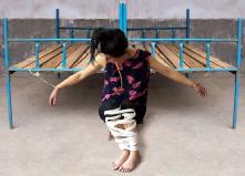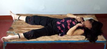 ![]() 当年的洗脑班——位于西郭庄的废弃第四派出所,江静在骨盆严重骨折的情况下所遭受的迫害。(演示图) | ![]() 邪恶之徒将江静拖至只有几块高低不平的破旧木板组成的铁床上(演示图) |