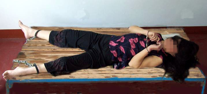 后来江静又被恶警们每天24小时身体成大字形捆铐在床上近一个月。腿常常用约束带固定捆绑在床上,看到江静弄开了捆绑腿的绳子,她们就又狠劲的给她重新捆绑。