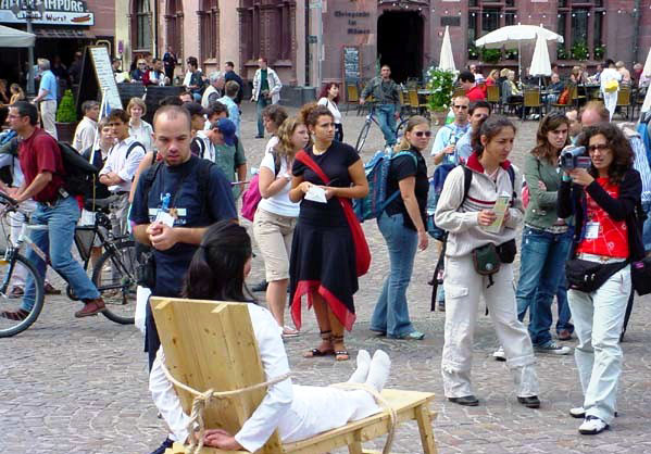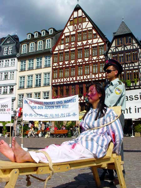 扇型展开的反酷刑展,其中心是“伤痕累累、血迹斑斑”的法轮功学员被捆在老虎凳上、用铁链锁在囚笼里、和被竹签钉入手指的酷刑模拟再现场面,左侧布置的是“真善忍”画展,在右侧学员表演功法,右侧前方是信息资料平台和签名留言处。最后面是一字排开的中德文大型横幅:“请您帮助制止迫害法轮功”、“中共公然实施酷刑谋杀”、“这一切正在中国发生”等。