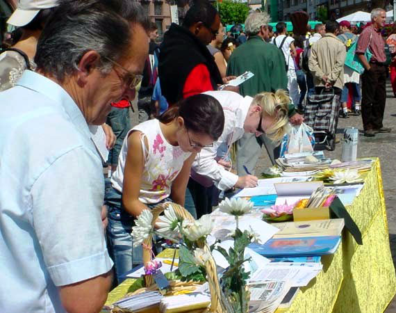 观看的人们眼中脸上流露出震惊、愤慨和同情,表现酷刑内容的画展前常围成几层的人墙,信息资料台前签名、留言者络绎不绝,很多小孩子跑到囚笼和老虎凳近处弯下身看,许多人用照相机、摄像机拍摄下来,上千的人接受了传单、报纸、书签和光盘,和学员攀谈的更是不计其数。