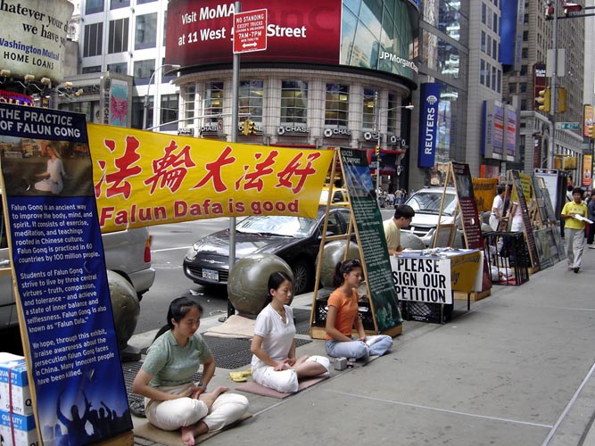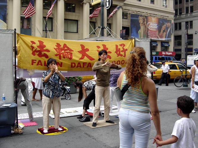 来自南台湾屏东的三位家庭主妇学员,子女已长大,获得家人的支持,长期在曼哈顿讲真象,她们参与每天曼哈顿街上的反酷刑展,以揭露中共对大陆同修的残酷迫害手段,她们有时扮演被迫害同修、有时派发传单、有时展示功法,有时去中领馆前发正念,无论晴天和雨天一天没落下。虽然她们只学会一点英文,但是来签名支持的人很多,有人还抱着学员激动的又哭又亲的,有人要捐钱帮助,但是都没收,只希望他们能把真象告诉更多人,电视和报纸的记者都来采访、拍特写镜头。