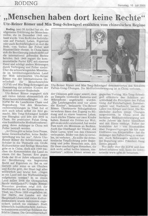 七月以来的两场中国人权报告会通过当地的报社——卡姆日报(Chamer Zeitung)和拜恩回响报(Bayerwald-Echo),还有约瑟夫·富奥恩霍夫高中的学校网站 https://www.jvfg-cham.de/jvfg/aktuelles/news/2005_07_22_29263645_meldung.php?navid=1