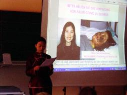 报告会的中间,法轮功学员播放了天安门自焚真象影片,揭露中共诬蔑法轮功的欺世谎言。之后,法轮功学员向大家展示了祥和的法轮功第五套功法-神通加持法。顿时,报告会现场的气氛被带入了一种宁静祥和的境界。在同学们试着学炼了简易的第三套功法之后,大家静静的听学员讲述法轮功学员在中国的遭遇,同时了解到,他们的签名救援可能意味着法轮功学员免遭酷刑折磨。比如被营救回德国的法轮功学员熊伟,就曾在卡姆的市府大厅陈述:她在监狱里得到相对其他法轮功学员来说略为宽松的待遇,当时她就想到可能在大墙之外有营救她的呼声。