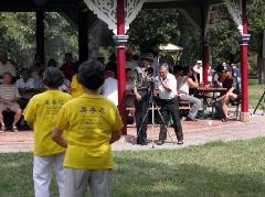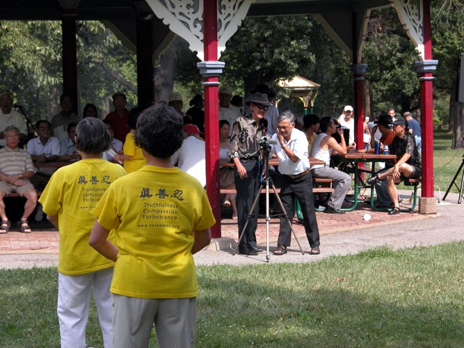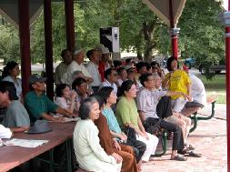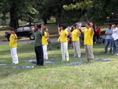 “到了今年夏天,他们找我,因为他们非常想继续炼法轮功。我们安排了每星期一和星期四从早晨9:00点到11:00点在公园炼功。这一组有15到20人。这组人炼得非常认真。”