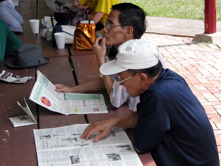 “后来,叫做‘老年公民’的另外一组人听说了,也要求给他们演示功法。从此,叫做‘老年公民’的这一组在公园炼功,每星期五早晨从10:00点到12:00。这一组大约有30人。至今有2个月了。有时在语言沟通有一点问题。他们只会越南话。”Kim说,“我因为要上班,只要时间安排得开,我就来,但不能保证每次来。另一位学员Corrina每星期准时来教他们炼功。”