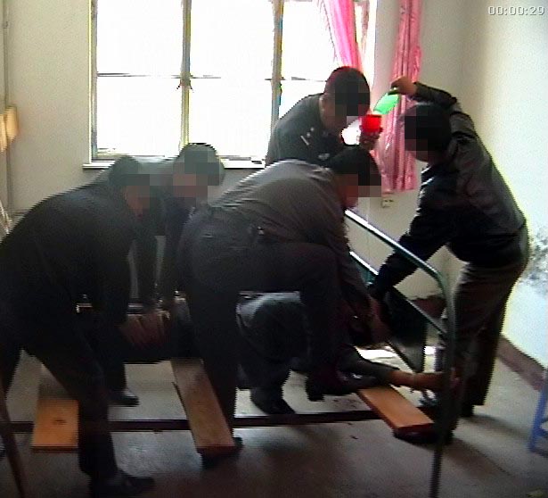 2003年,朝阳县公安局酷刑逼供,吕大伟身上衣服被扒光打出无数血口子,嘴被打出血。第二天在看守所里,副所长郝乃峰用电棍对吕大伟长时间电击。在他绝食期间灌食迫害,用竹板撬开嘴,用手指粗胶管插入喉咙,插进去再拔出来,长达几个小时折磨,又用一种特别刑具,把人固定到木板上,几次把人窒息过去。(图四)
