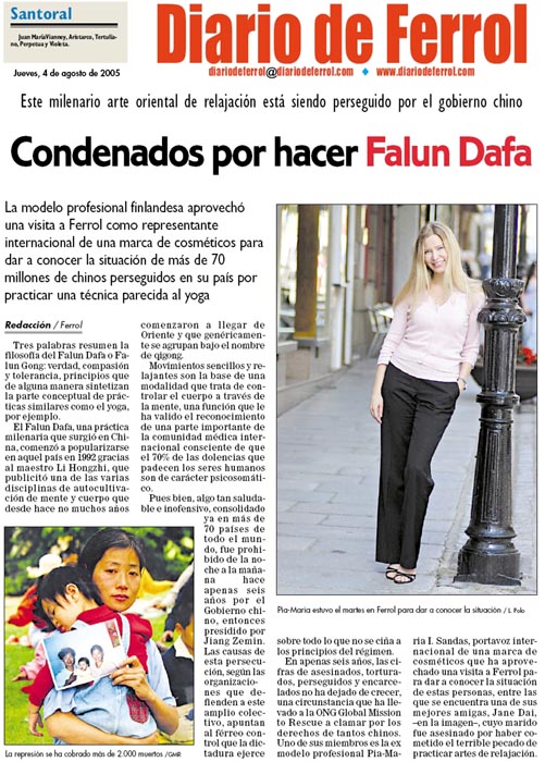 法轮功学员琵雅-玛莉雅-珊达斯(Pia-Maria Sandas)曾是一名芬兰模特,现为一化妆品牌的国际发言人。她为推销该化妆品访问西班牙的费罗市(Ferrol),期间不失时机的告知大众关于中共迫害法轮功的真象,并以她的好友戴志珍女士丈夫的死为例,让世人了解在中国人们仅仅因炼法轮功就遭到迫害。