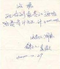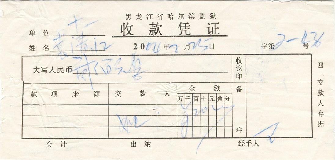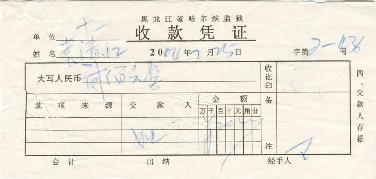 在这里需要特别说明的几点是:恶党不法人员迫害的不只是袁清江本人,其家人也是这场迫害的直接受害者。袁清江打横幅被绑架,在京非法关押几天后,就由哈市香坊区安埠派出所干警劫持回香坊分局,数月后被非法送往长林子劳教所劳教。可是其家人直到2000年冬天,袁清江被非法关押了8、9个月以后,才知道袁清江被关押在长林子,才允许接见。而袁清江此次被绑架后,安埠派出所干警周凉却以欺骗的手段,向其家人索要上北京接袁清江的所谓接人费5000元,袁家很困难,其家人说没有那么多钱。周凉问:那你们能给多少?袁的家人以为只要给周凉钱,袁清江就能平安回家,凑了3000元钱交给他。但事后袁的家人方知他们去北京接好几个人,只向袁家勒索接人费,并不放人。(附票据为证,图3)