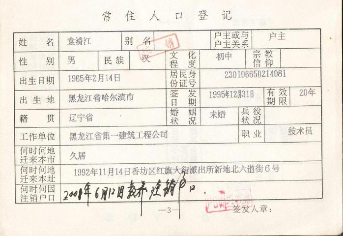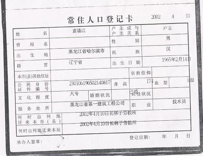 袁清江被非法判劳教后,安埠派出所竟以2001年6月12日袁被教养为由,将其户口注销。其实该时间袁清江已被教养一年零四个月,超期关押四个月了,时间根本不符。(附户口影印件,图4)2001年8月3日,袁清江从劳教所被放回,安埠派出所又在袁的户口上注明袁是2002年4月10日从长林子劳教所迁回的字样。(附户口影印件,图5)负责办理户口事宜的是安埠派出所的一个小个警察,他曾向袁清江的家人炫耀,当时去你家抓人的就有我一个。