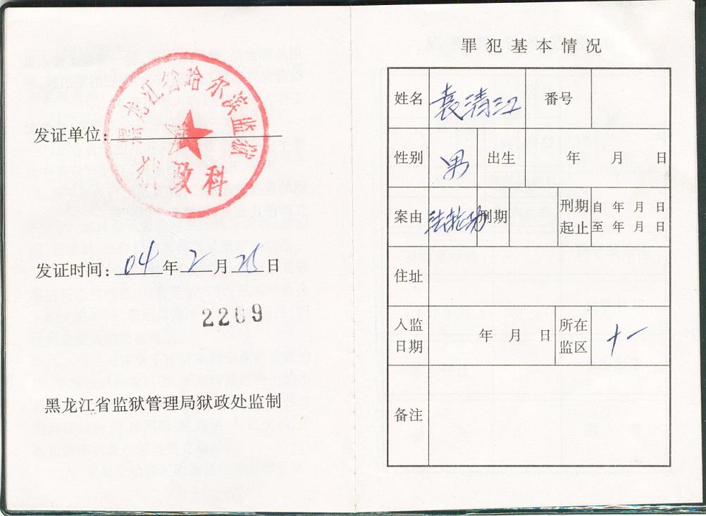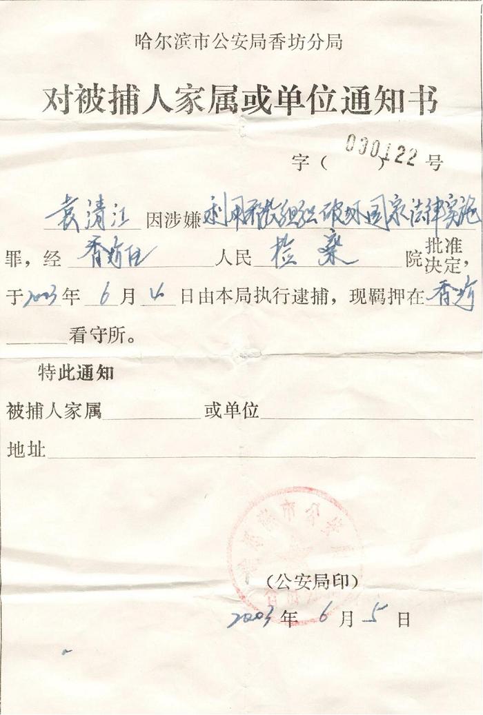 袁清江是2003年3月7日被不法警察绑架,家人在2003年6月5日才接到“对被捕人家属或单位通知书”(附影印件,图6),袁清江先是被非法关押在香坊看守所,后被非法判刑四年。