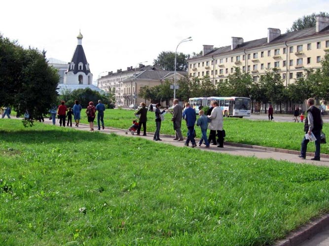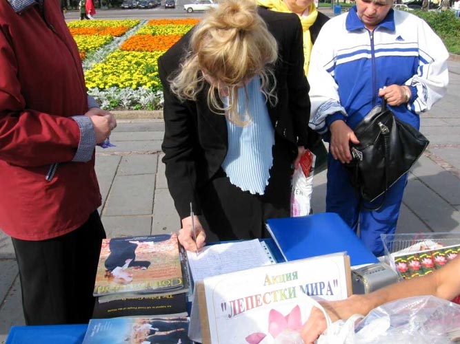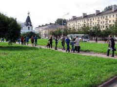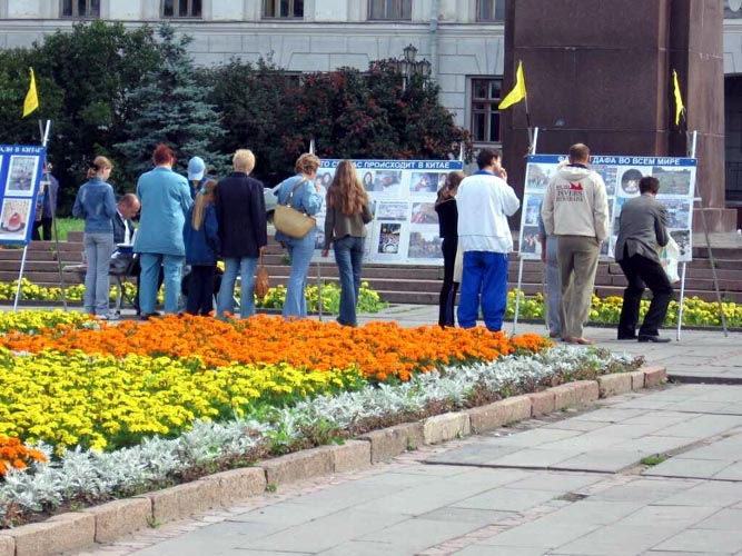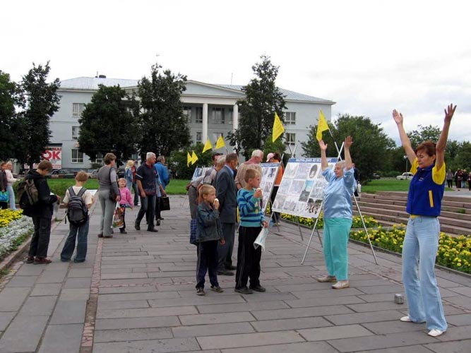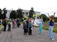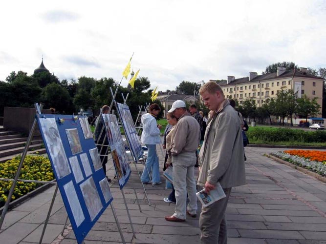 8月13日周六,我们在普斯科夫古代宫城——克里姆林宫附近的市中心广场举行了五个小时的活动,学员们摆上真象展板,内容有“法轮大法洪传世界”和“反酷刑图片展”等;大家分成几组,有的在展板前向观众讲解,有的教有兴趣的人们叠纸莲花并介绍其象征的涵义,有的展示法轮功五套功法,有的到广场附近的车站和市场等地发真象资料。