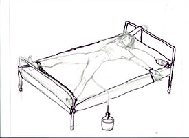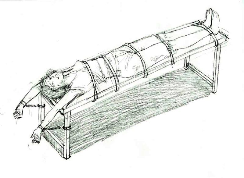 好几个警察把我按在床上,手脚向四个方向使劲的抻,把身体抻的很直,然后用手铐把手腕脚脖铐在4个床脚上。当时我的脚上还戴着几十公斤重的脚镣,脚镣的大铁环卡在脚踝骨上再用手铐铐上,真是疼痛难忍,而且手脖当时就被手铐卡出了血。其中一个警察说:“这哪是对待人,简直象杀猪。”然后他们又从鼻子里给我插上胃管,强行灌食。灌完食后他们故意不把胃管系好,灌到胃里的东西全都返了出来,肩头上脖子上全都是返出来的粘乎乎的脏东西。他们不放我下来上厕所、给我插上排尿管。那些天正赶上我来例假,他们把我下半身衣服扒光,身下铺上塑料布。当时北京的气温在35、36度,地下室里,没有窗户,更没有通风设备,闷热潮湿,腥臭难闻。我满身是汗,身下被潮乎乎的分泌物浸着,肩头和脖子上返出的脏东西散发出难闻的气味。他们就这样绑了我近20天。在这段时间里,每当我感到疼痛难忍时,我就会不知不觉的睡着,睡着后我感到很舒适,没有被铐在床上的感觉,可以翻身,胳膊腿都可以自由活动。有一天我在似睡非睡时,看见一条大蛇张着血盆大口,在空中向我直扑过来,我一点怕的感觉也没有,静静的看着,当这条大蛇接近我时,从我身上突然弹出一把剑,直射血盆大口,那条蛇被直挺挺穿在剑上。我睁眼一看周围一切照旧。我明白了我们每个大法弟子不但有师父的法身和护法神的保护,而且还有护法器。