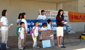 一行十人的团队,每个人都身着写有“营救被迫害的法轮功儿童”字样的白色T恤衫,其中四人是大法小弟子,他们与父母一起在这短短的两天时间里,不辞辛苦的奔波,希望通过大家的努力,能使中国大陆那些与他们年纪相仿的孩子也能象他们一样拥有一个快乐的童年。在新闻发布会上,有两位小弟子发言说:“请大家支持营救在中国的法轮功孤儿。”