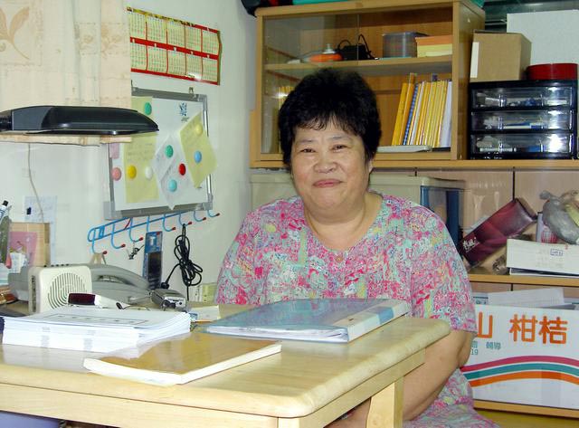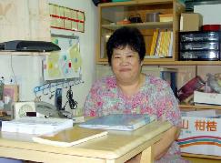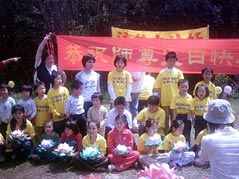 ![]() 邱瑞珠在学法的书桌前 | ![]() 参加洪法活动(后排左边第一位) |