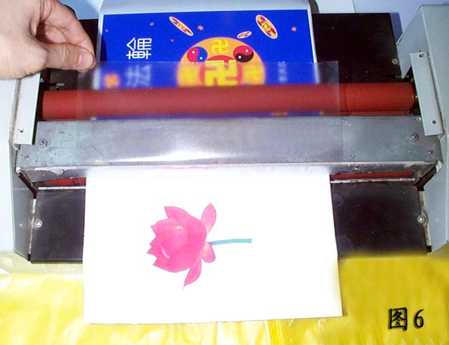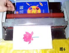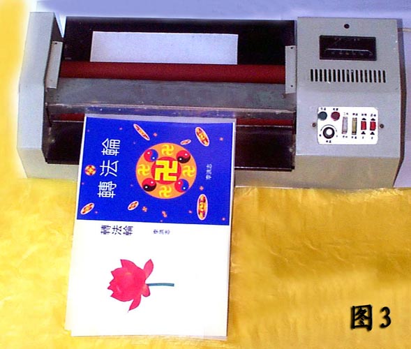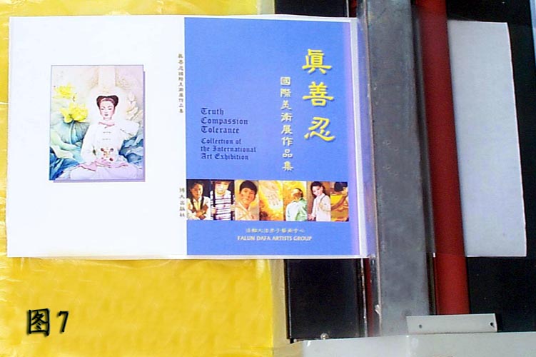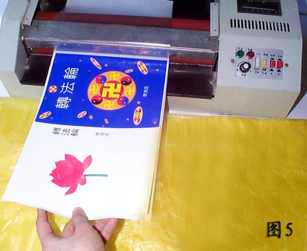 4、打开塑封机就可裱膜。最好再有一个人帮忙开关塑封机,因为需要两个手同时把书皮抚正(图5)。请按开关的同修把裱膜的底端向自己的对面略微拉紧,随着裱膜接近全部走入塑封机再松手(图6)。这样裱膜的书皮非常平整,百分之百的成功率,几乎不会象手工裱膜那样容易出现气泡和褶皱。上面2~4的方法用冷裱机同样适用。内页的师父照片也应该裱膜。以前印刷厂印制的《转法轮》是没裱膜的,翻阅时间长了就会有局部的颜色被摩擦掉了。真善忍国际美术展作品集的书皮也可以一样裱膜(图7)。