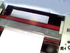 3、拿来准备裱膜的书皮比较一下塑封机外面的裱膜应该足够长,接着就可以把没走入塑封机的裱膜由底端全部从衬纸上揭起来,平放到塑封机的上面,这时裱膜的胶面向上了,底端放在自己的对面略微拉紧之后放下(图4),接下来就可以把要裱膜的书皮面向上放在下面的衬纸上,注意先走入塑封机一端的书皮要平整,两个角不要翘起,这一点很重要,注意书皮的表面要洁净。