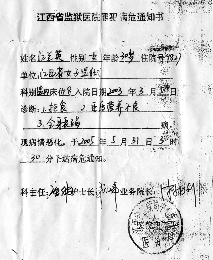 事实上,这份病危通知书是2005年5月31日由长征医院(劳改医院)直接下到彭家桥街道办事处书记手中,一直隐瞒压制。其间2005年6月份恶警逼迫江兰英父母在一张写好了字的纸上签字,表示出了问题自己负责。