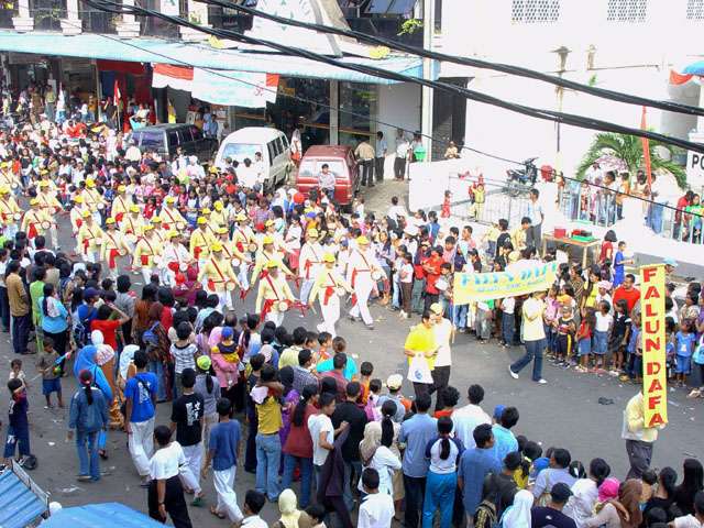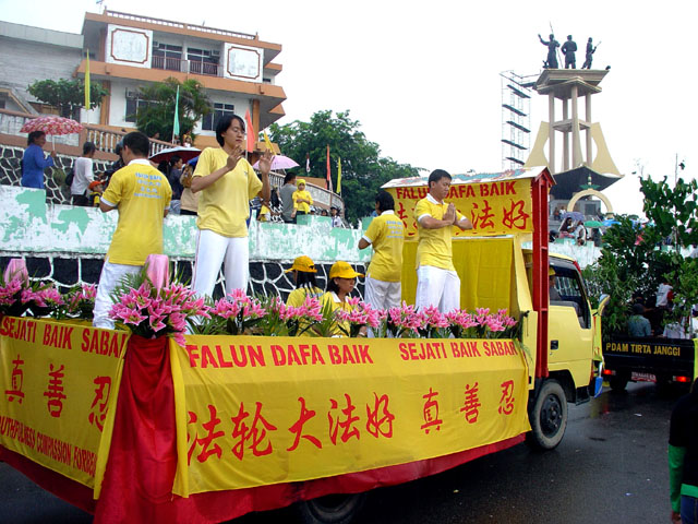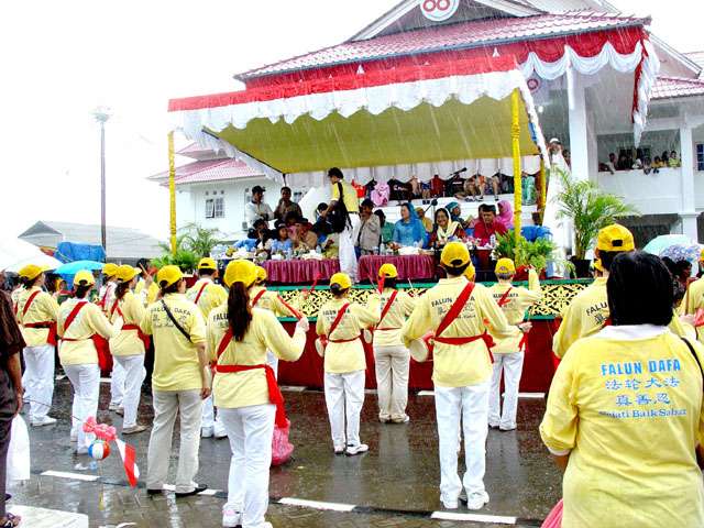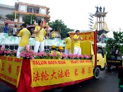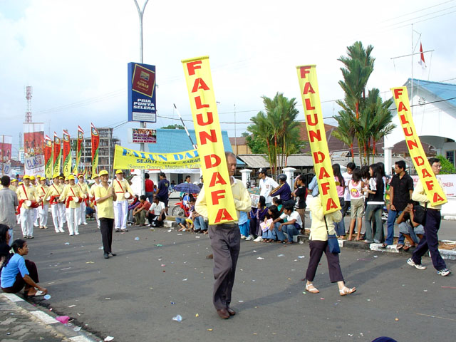 游行在下午一点钟开始,突然一阵大雨来袭,当人们都在慌忙躲雨时,一阵整齐的腰鼓声突然冲破阴霾的天空,回响在喧闹的城市中。立时,喧嚣的街道仿佛被震撼了,一下子安静了下来,大家都在倾听法轮功学员们的阵阵腰鼓声,沿路上人们还争相索取法轮功真象资料,询问哪里有炼功点可以学功,哪里可以买得到印度尼西亚文的《转法轮》,连正在执行任务的警察都不例外。人们都显现出惊喜和期盼的神情。