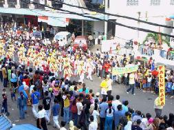 ![]() 昂首阔步的法轮功腰鼓队 | ![]() 争奇斗艳的各民族服饰表演 |