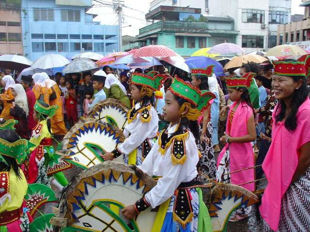 虽然周六的天气阴晴不定,但并没有影响人们的心情,大家纷纷走出家门,从四面八方涌到游行的主要街道,希望借此机会观赏到具有各种民族特色的方阵。今年的国庆游行共有100多个队伍参加,包括印度尼西亚不同民族的婚礼及节日盛装,这些民族服饰争奇斗艳、美不胜收。