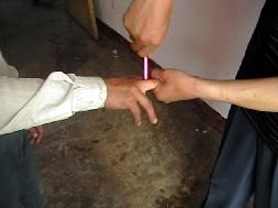 四、“开锁” :恶警指使犯人把开铁门的钥匙插在两个手指中间,一只手紧握着我的手指不让动,另一只手用力转动钥匙。我疼的直出汗,手指间的肉都被拧破了(图 四)。还有一次,犯人用牙刷把强行“开锁”(图五)。