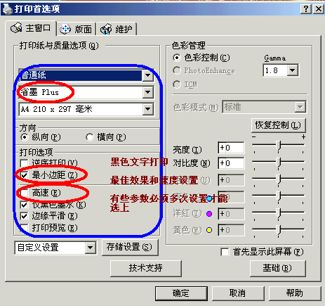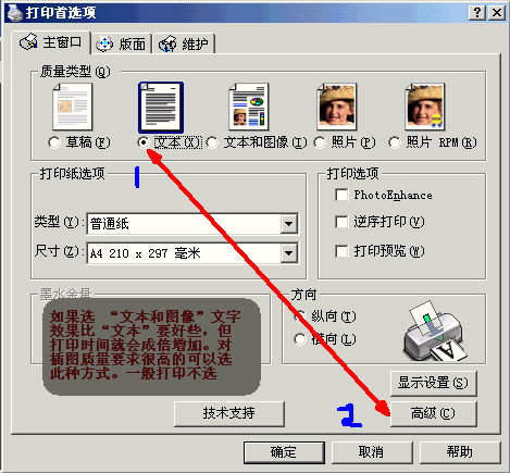 打印文本稿件,默认的选项是“文本和图像”,这个速度很慢,我们选文本,速度会提高1倍以上,质量也很好。在无图像底稿或对底稿治疗要求不很高的情况下使用。如果是黑白稿件,一定选“仅黑色墨水”。