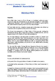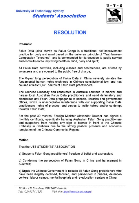 e) 学生会决定致信澳洲总理,敦促他公开要求(中共)立即停止对中国法轮功学员的虐杀、酷刑、折磨和其它非人道的残酷迫害,并帮助营救澳洲居民在中国因为修炼法轮功而被迫害和关押的亲属;