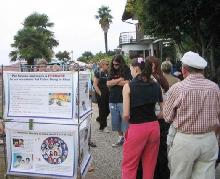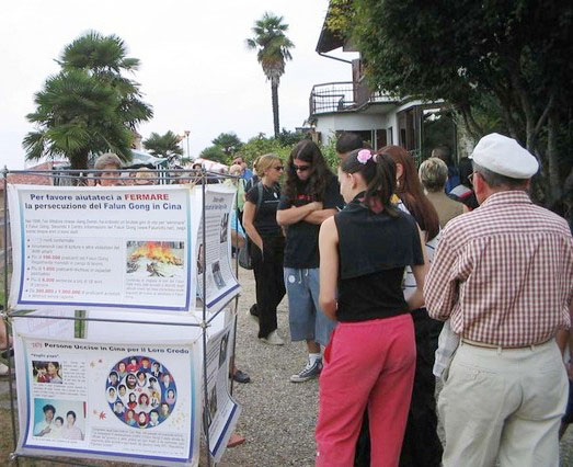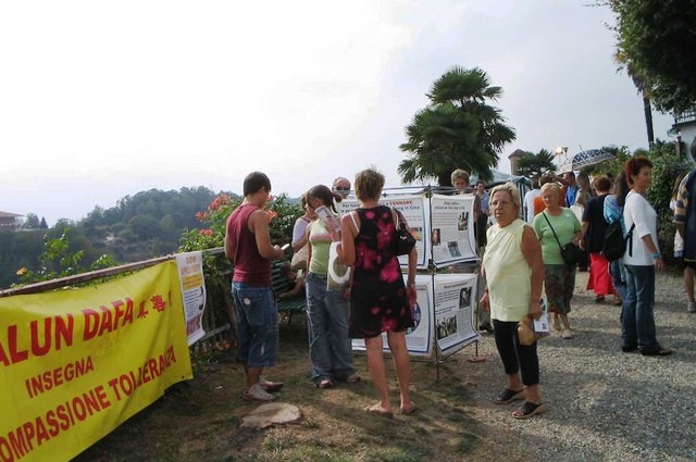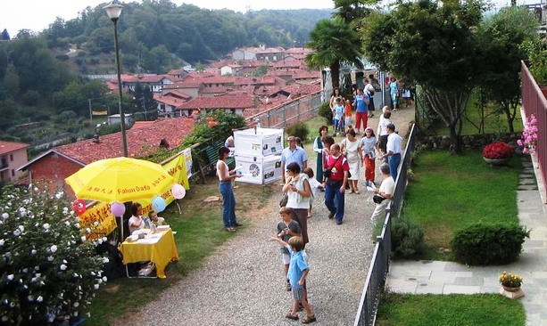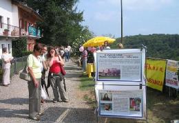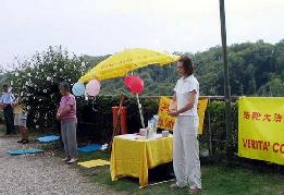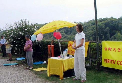 活动的前一天,两位中国学员在黄色的太阳伞上用中文和意大利文写上了“法轮大法”。在写着“真善忍”的横幅前,学员们摆好了签名的桌子和各种语言的法轮大法传单。