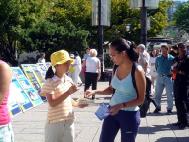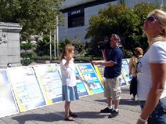法轮功学员一边讲真象,一边向人们征签给加拿大总理马田的请愿信。签名信请求马丁在胡锦涛访加时,向其提出停止迫害法轮功的要求;同时,要求加拿大政府按照国际人权法和加拿大“反人类和战争罪”相关法律履行责任,拒绝向薄熙来和夏德仁发放签证。