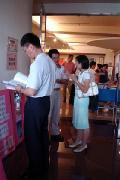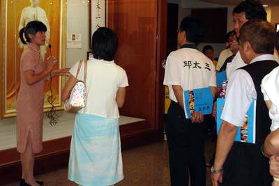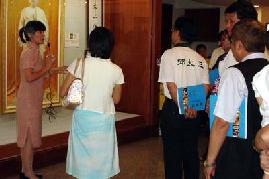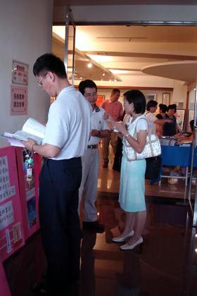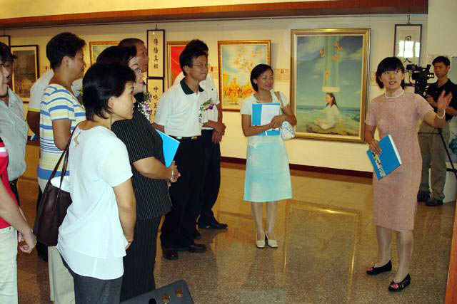 ![]() 民众在展览入口处看资料 | ![]() 观众聆听导览人员解说作品内涵 |