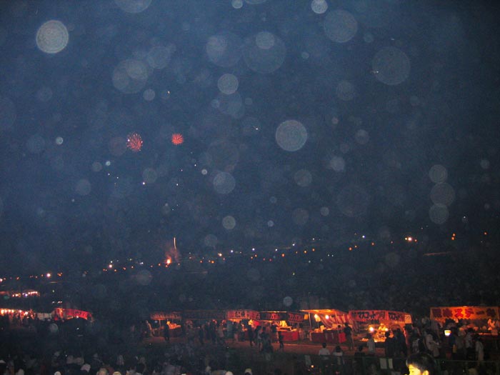 当时气温大约三十五、六度,火辣辣的太阳当空照下来,晒得人浑身冒火似的热。会场内的观光客在搭起的帐篷里悠闲的喝啤酒、冷饮,品尝美味佳肴,大法弟子们在烈日下不停的向不断涌入场内的旅游团递上报纸。许多人接了报纸,还关切的询问报纸的内容,认真的听学员讲真象并仔细阅读报纸。有的人双手接过报纸表示谢意。有的会中文的老先生还要和学员说几句中文,高兴的拿着报纸走了。也有人不理解,问为什么选择今天发这个报纸,学员回答,今天来的人很多,我们希望更多的日本民众了解法轮大法的真象。虽然也有对法轮功存在误解的人,但学员不为所动,带着希望更多人了解真象的真诚愿望,继续不停的发。直到夜幕降临,满街满巷的人们都开始观看烟花的时候,大家才离开会场。