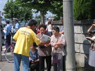 东北地区的法轮功学员去年也来过大曲的烟花大会发真象资料,从那时候起,一年来,学员们利用周末和节假日,驱车三千多公里,先后到秋田市、青森县北部的八户市及邻近地区、青森市、山形县的山形市、新庄市、鹤冈市、宫城县内的几个地区洪法讲真象,今天再次来到大曲。东北地区哪个地方有大的庆典活动,学员们就到哪里,没有节日活动的时候就到各个还没有法轮功学员的地方发报纸,让那些地区的日本民众也能有机会了解大法。学员们有的是现在在大学里的博士、硕士生,平时学业繁忙,本来休息时间打工谋生,也请假出来了;家庭主妇把家里安排好也前来帮忙;大学的老师把幼小的孩子留给家里,带着干粮,驾车上路了。据组织这些洪法活动的学员讲,他们还要继续做下去,十月份计划去福岛县的几个城市,而且希望以后有可能跨越海峡到日本最北部的北海道去洪法。