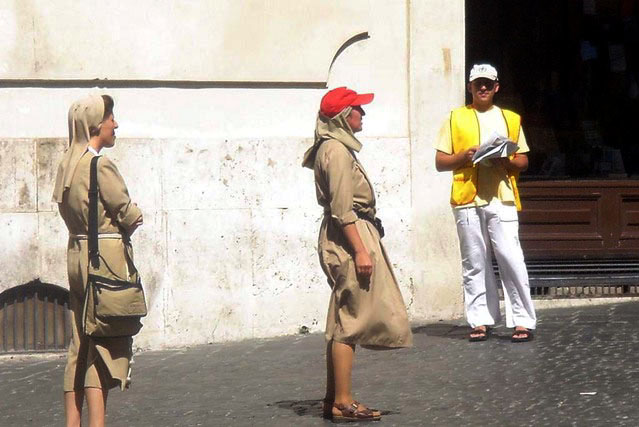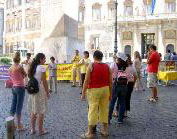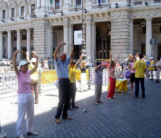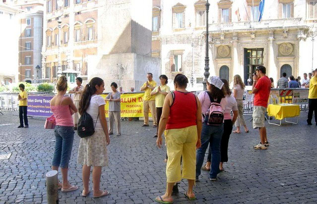 七月的罗马,游人如织。许多来自中国的旅游团在罗马古竞技场看到这么多西方面孔的法轮功学员都感到很震惊。有些人索取资料,更多的人兴奋的拍照和录相。而意大利人和许多其他国家的游客则纷纷签名支持法轮大法和谴责中共的暴行。许多人看过揭露中共酷刑迫害法轮功学员的图片后眼里都闪着泪光。