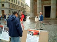 现场也准备了手工折的精美纸莲花发给小朋友们,他们接到后都表示非常感谢。学员们也发出英文、俄文、中文、德文和西班牙文等语种的法轮功真象小册子给许多游客。天空虽然飘着细雨,但是活动仍然继续着,一会儿之后,太阳就出来了。