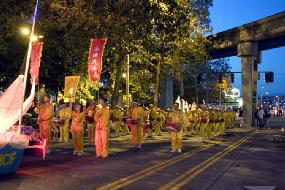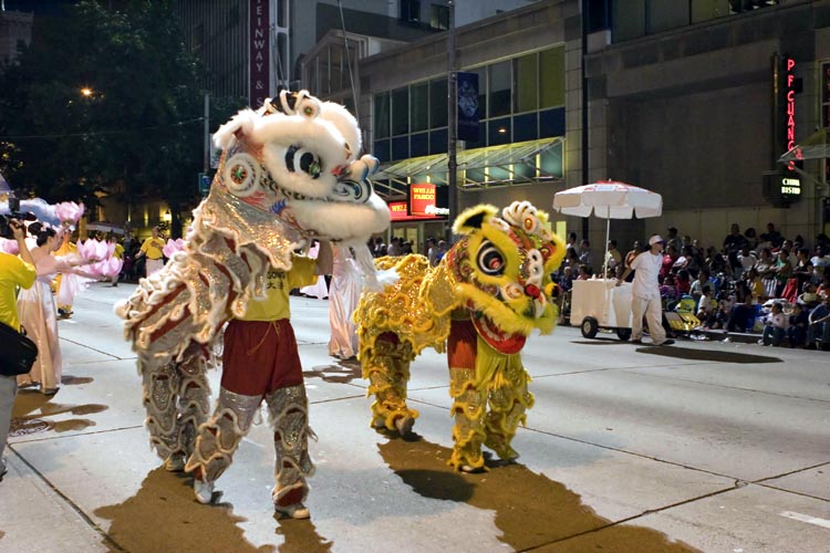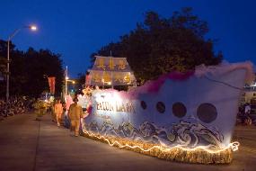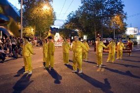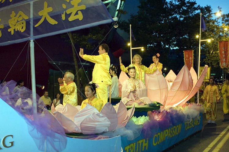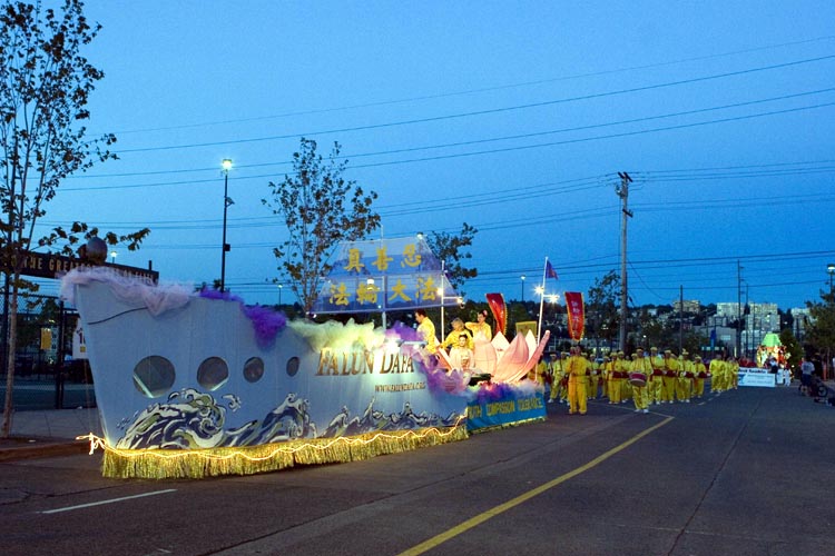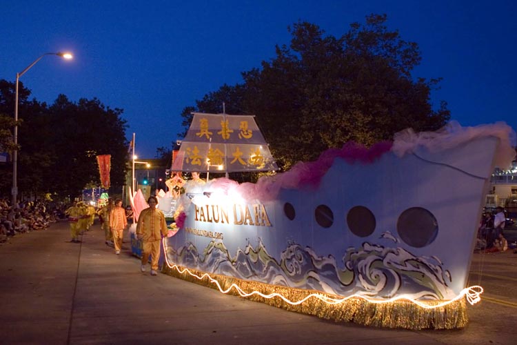 来自华盛顿州各地、俄勒冈州波特兰,和加拿大温哥华的部份法轮功学员参加了这次盛大游行。晚上约9点,在最后一丝夕阳中,法轮功学员们的队伍出发了。两位女学员打着“法轮大法”的横幅走在最前面,两头中国舞狮精神焕发、紧随其后。6位女学员身着粉色传统服装,手持灯光闪闪的莲花在音乐中翩翩起舞。随后的是天蓝色的“大法船”花车。“法船”高大无比,气势雄伟。上面英文大字“法轮大法”和大法网址金光闪闪。船的底部画着逼真的波浪,加上金色线条灯构成的波浪,就使得“大法船”的前行格外的显出乘风破浪的气势。船头后面的花车部份竖立起大船帆,上书“真善忍”和“法轮大法”的金色大字。花车上,大、小莲花里的学员和另一位年近80的老年学员面带微笑的展示静功,莲花叶上仙女打扮的女学员向观众频频招手。两位西人弟子炼着动功。这7位学员代表了修炼法轮大法的人群中囊括男女老少、华人、西人。金黄而柔和的灯光把花车上粉色的莲花烘托的格外美丽圣洁。