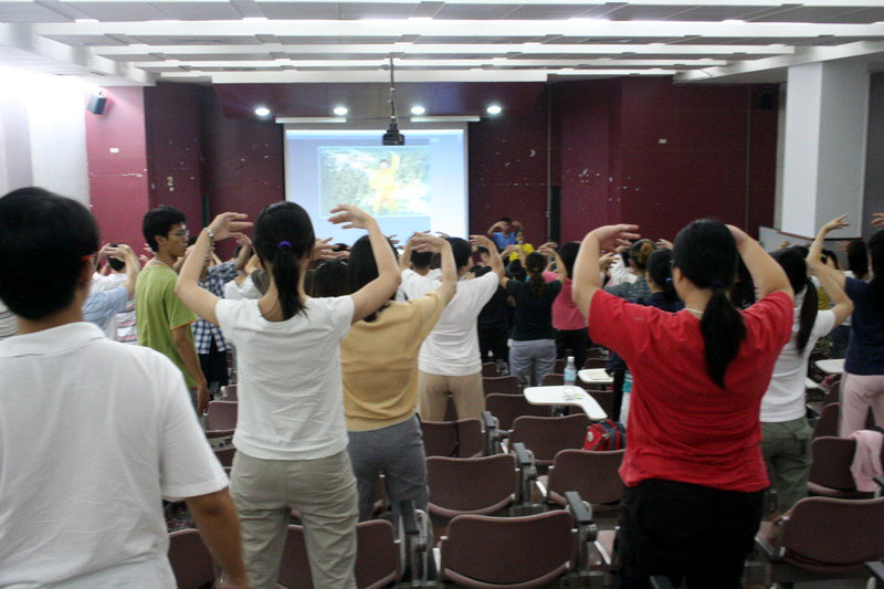 活动中,除了播放法轮大法创始人李洪志先生在大连的讲法外,也有五套功法的教炼。此外,还安排多位法轮功学员分享修炼后身心受益的心得。这几位来自不同领域的法轮功学员,演讲的题目也相当丰富,其中包含:东华大学企管所硕士李健豪--《生命中的万能钥匙》;工研院工程师施学兢--《超常的科学》; 上海同德堂中医师胡乃文--《做个健康的人,为社会负责》;台大教授陈彦玲--《看见未来》等等。演讲的内容不但有条有理,生动活泼,还深具启发性,深受青年学子好评。