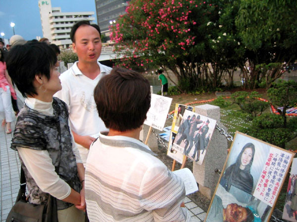 【明慧网2005年8月7日】2005年8月6日是广岛原子弹爆炸60周年纪念日,当年那颗原子弹杀害了众多的老百姓。每逢纪念日,都有许多游人参观原爆遗址。借助这个机会,当地法轮功学员举办了讲真象活动,希望帮助更多人了解发生在中国对法轮功的残酷。下午,学员们在原爆遗址的对面摆看板,讲真象。晚上举行了悼念被中共迫害致死法轮功学员的烛光守夜活动。