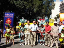 【明慧网2005年8月9日】2005年8月6日,法轮功学员应邀参加加拿大安省HAMILTON狂欢节。由于去年法轮功学员的游行给观众及组织者印象深刻,今年组委会特意发来邀请并将法轮功安排在游行队伍的第一位。组织者在开场剪彩时,特意请学员持两面绣有法轮图形的彩旗作为开场仪式的背景。