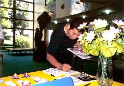 ![]() 来宾们专注的聆听现场解说 | ![]() 明白真象的民众在留言簿上写下自己支持法轮功的心声 |