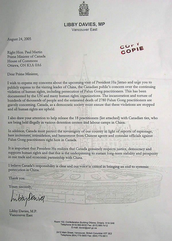 我希望表达我对中国国家主席胡锦涛即将来访的关注,并迫切要求您公开表达加拿大公众对中国持续性侵犯人权的关注,如迫害法轮功修炼者。联合国及许多人权组织都有文档证明(迫害事实)。我对数十万法轮功修炼者被监禁,酷刑折磨,约2780人致死表示沉重的关切。作为一个民主社会,加拿大必须制止这些侵权行为,确保所有人权得以维护。