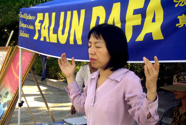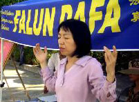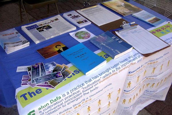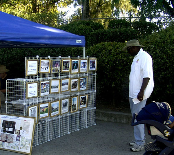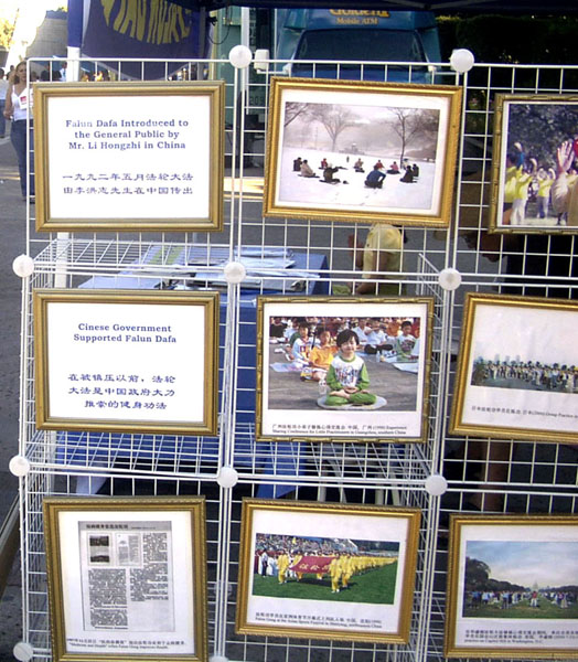 有一家人游玩出来,见学员在炼静功,父亲也向学员要了一张垫子,席地而坐,欲待打坐,却怎么也不能将腿搬上,还疼的呲牙咧嘴的,引的自己身边的一对小儿女也跃跃欲试,互不相让,年轻的母亲在旁忍俊不住,孩子们的稚气顽皮也感染了周围的行人。其实,就在旁边的像架上,就陈列着几幅醒目的,展现以前大陆小弟子集体炼功的照片,也是那么纯真可爱。可悲的是,目前却只能在海外公共场合看到这样的情景。