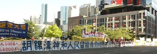 法轮功学员出现在胡锦涛来访的各条路线上,将“胡锦涛,神和人民留给你的时间不多了”的横幅高高打起,在从机场到酒店的7条高速公路桥上,直到酒店一路都可以看到这样的信息。在酒店外面,有上百个呼吁停止迫害的横幅及祥和的修炼人群。