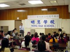 在自助餐室,各位家长同学欢聚一堂。举行了开学典礼。校长梁同宣先致词,感谢各位老师家长同学们的工作和支持。梁校长阐述了明慧学校的办学宗旨,那就是培育德才兼备、造福社会的优秀人才。