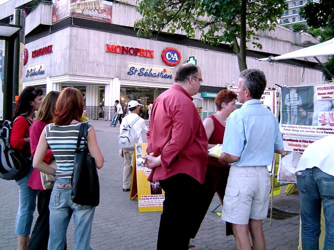 有一位曾经去过中国3次的法国女士说,中国的山山水水给她留下了非常美好的记忆;但并不知道那儿正在发生着如此骇人听闻的迫害。她和学员交谈了很多,最后在征签簿上签了名才离去。