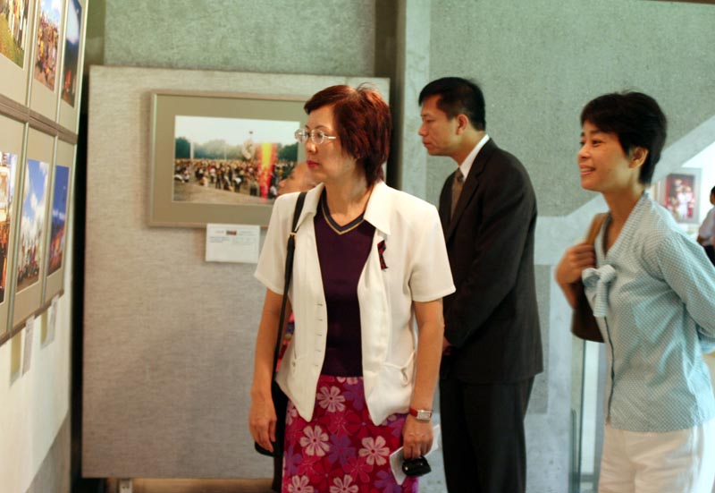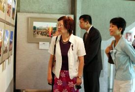 ![]() 法轮大法弟子证实法摄影展开幕式 | ![]() 文化总会副秘书长陈秀惠在开幕仪式前观看作品(左一) |
