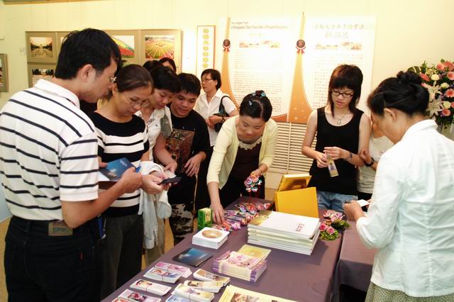 一位年轻的大学生,一进展览厅即感受此能量很强。等他看完一圈后,学员上前与他交谈,并介绍办此画展的缘由与展示的主轴,他又开始手微微靠近一张有法轮图形的中国大陆法轮功学员集体炼功排字的作品,他说他从高中即开始学练气功,这里有一股很强的能量吸引着他。导览员接着告诉他,自己修炼法轮功的益处,在不断的、反复通读《转法轮》,就会逐渐领悟到修炼所需的许许多多高深内涵。最后他很高兴的拿了许多资料,表示要回去好好的看。