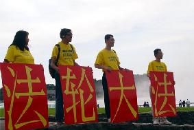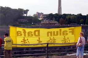 ![]() 学员们在山羊岛的草地上打出的标语 | ![]() 瀑布旁的法轮大法横幅 |