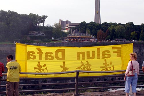 学员们也随时向身边的游览者讲真象,告诉他们正在中国发生的迫害,来此的目地;以及中共组织那些欢迎人群,是希望营造歌舞升平的景象,掩盖其杀人和侵犯人权的恶行。很多人明白了真象,当学员询问:“我们的横幅会不会挡住你们的视野?”他们纷纷说:“举高点。”